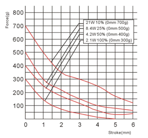 縱向:代表電磁鐵在對應(yīng)行程時的力量 單位為克(g)